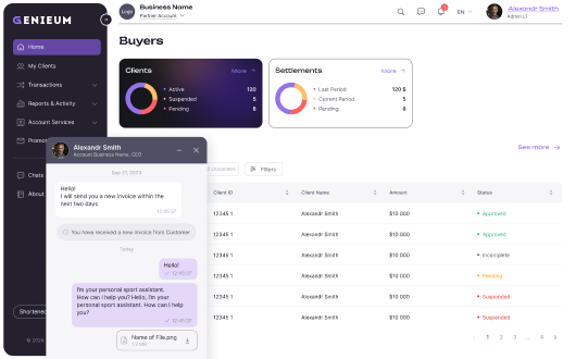 You can log in to your Genieum Account at any time to edit your Account details, manage users, request Supplier or Partner Role functionality, get reports and statements, review transactions, manage limits and support requests.